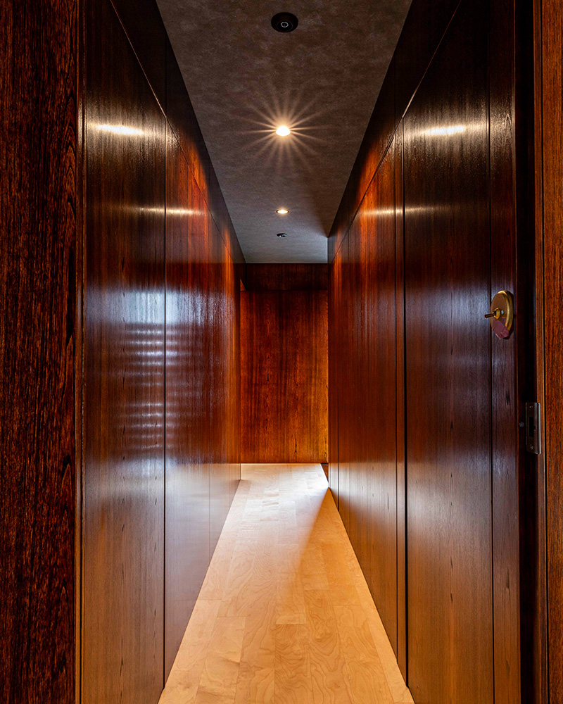 廊下の両側を拭き漆の壁が囲む、印象的な空間。