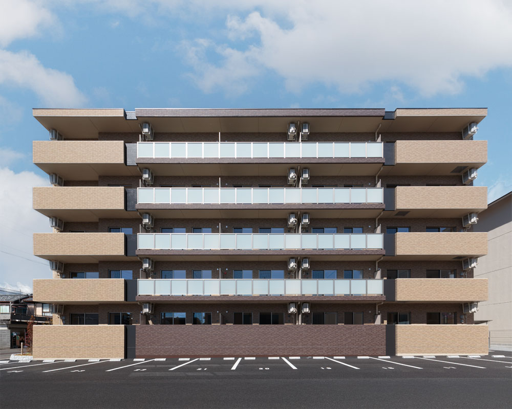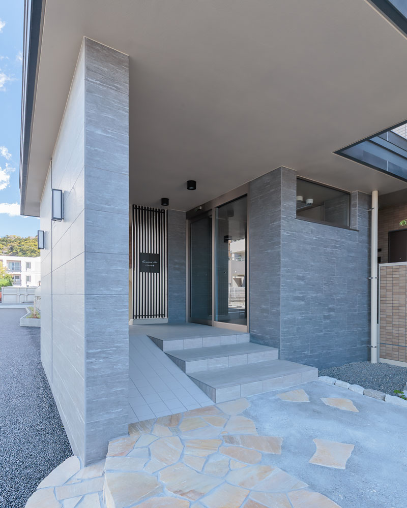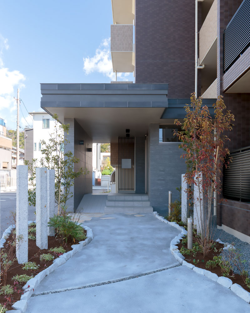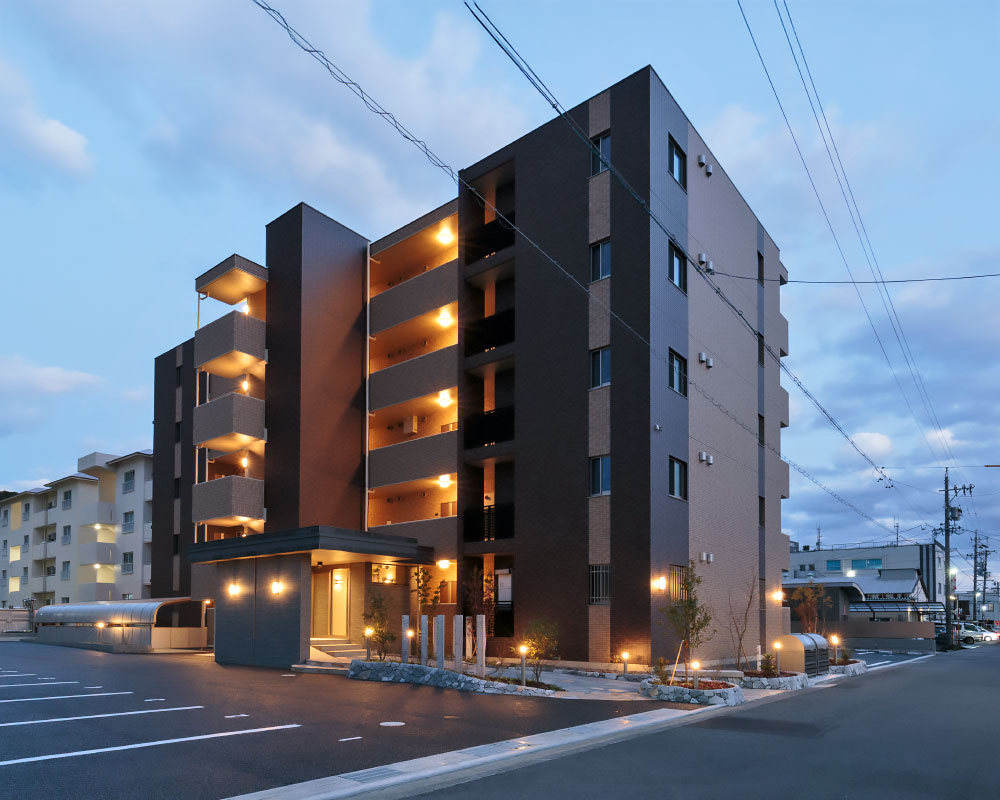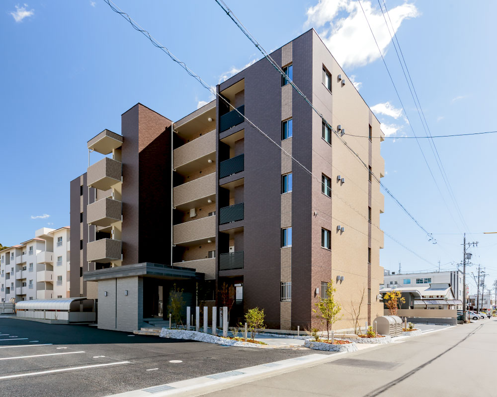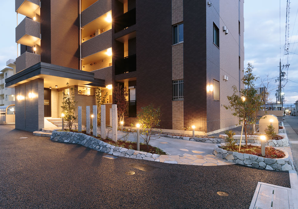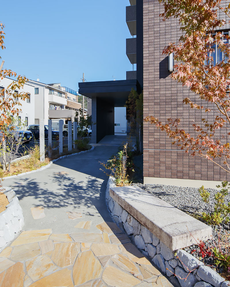 外観を彩るアプローチに、豊かな植栽、デザイン性を高める石柱、柔らかな曲線、温かみのある天然石を採用し、分譲マンションのような高級感を演出した賃貸マンションです。地域との共生を重視するお施主様のご希望で、アプローチには誰でも利用可能なベンチを設置。お施主様が定期的に開催される朝市と共に、入居者と地域の方々との交流の場となっています。入居者に長く愛される建物を目指し、断熱性能は高く設定(外皮性能ZEH相当)。将来電気自動車が増えることを予測し、駐車場には電気自動車用の充電スペースを設けました。