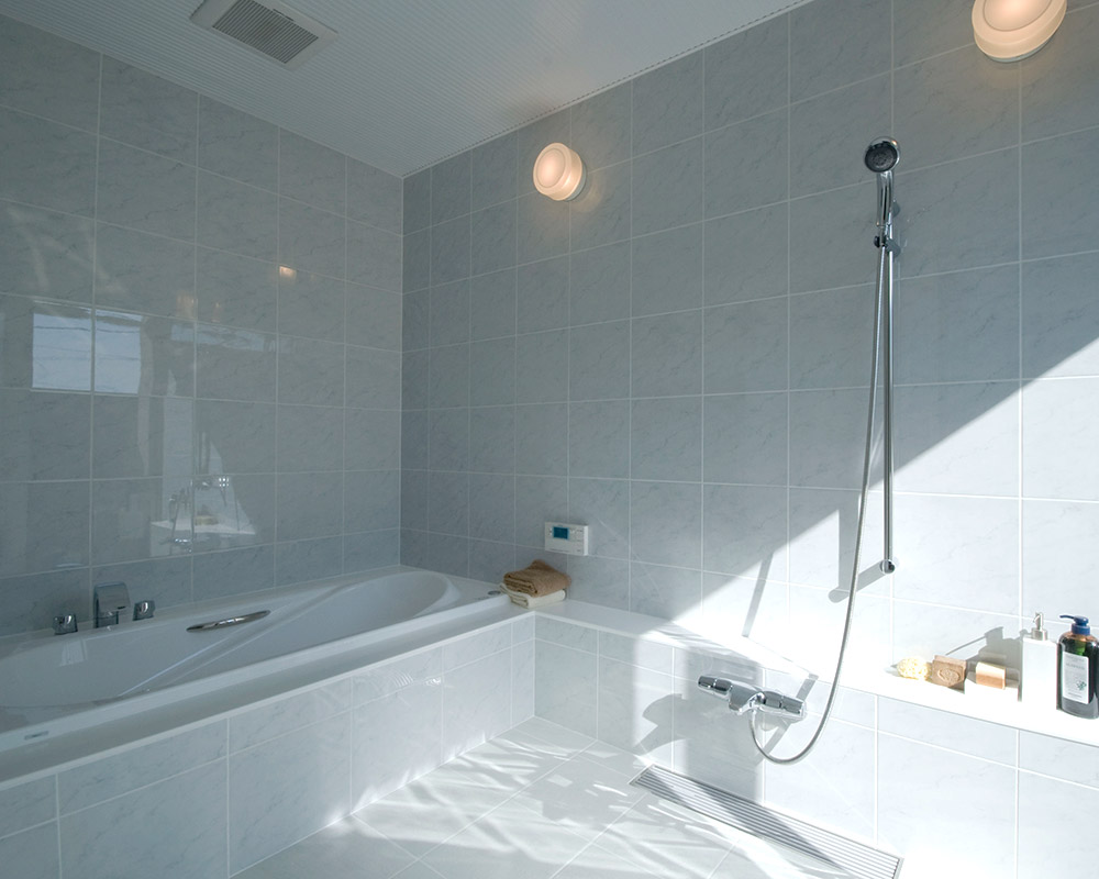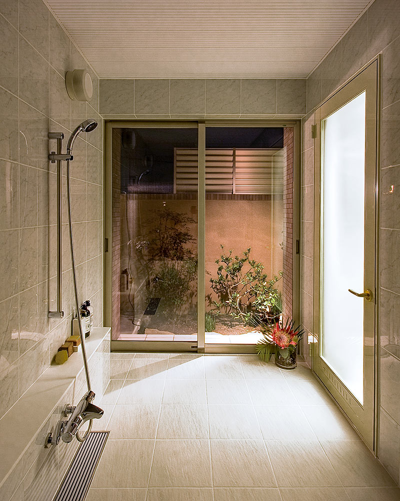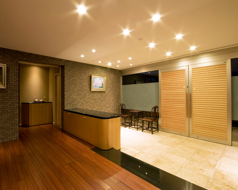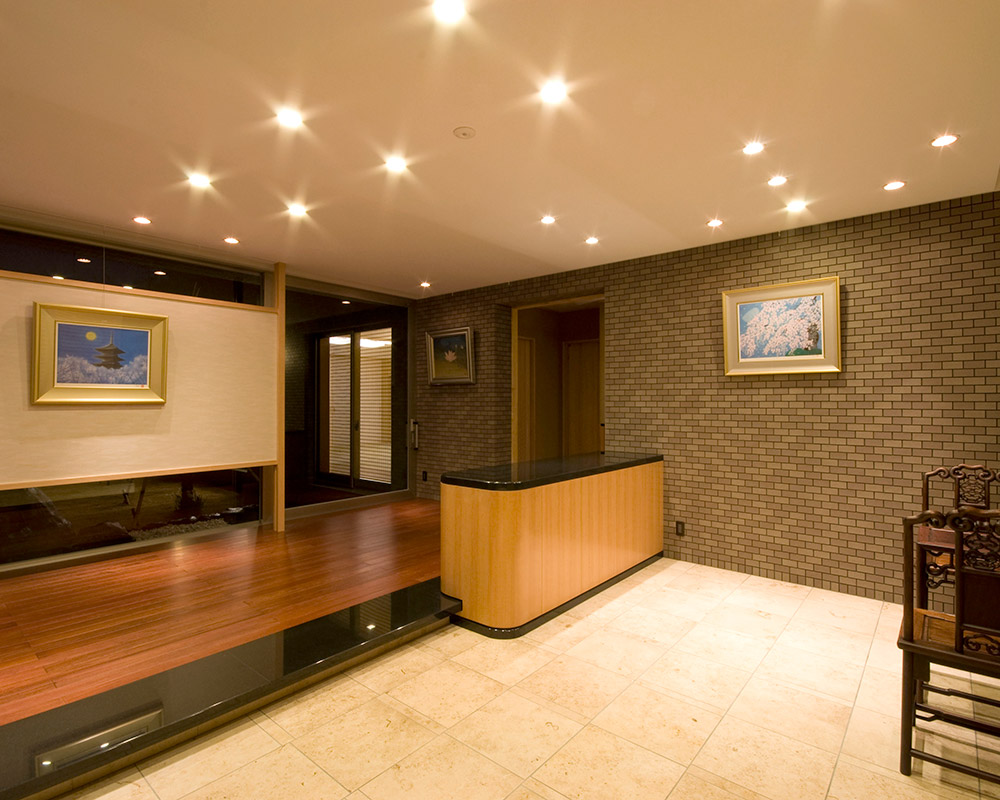 床は無垢のカリン材、式台は御影石、壁は外壁と同様のタイルを使用することで、外部の延長でありながら室内という中間的な空間となった。 来客時にはここが応接間の役割も果たす。