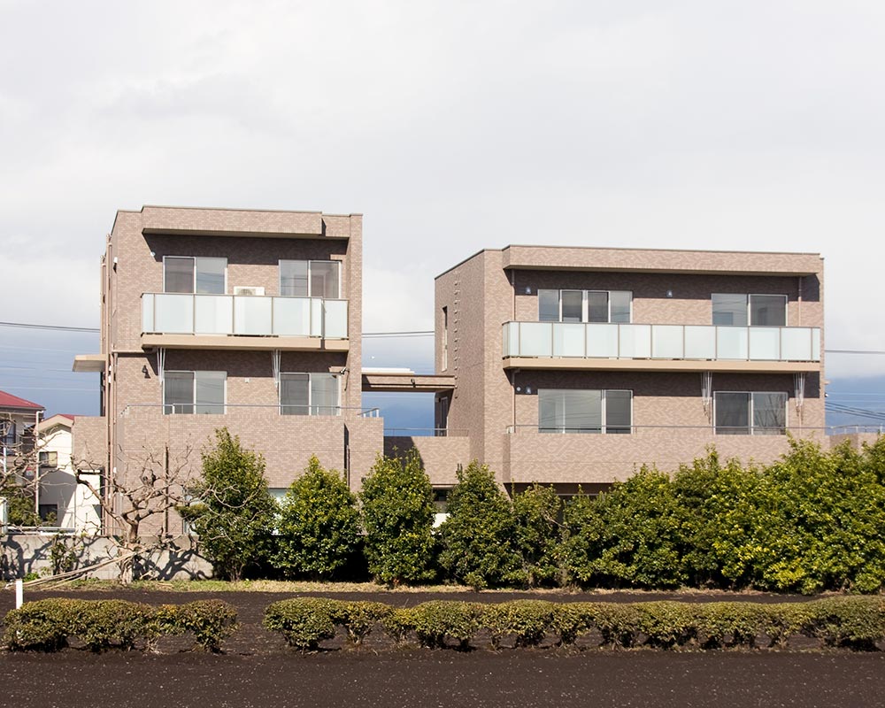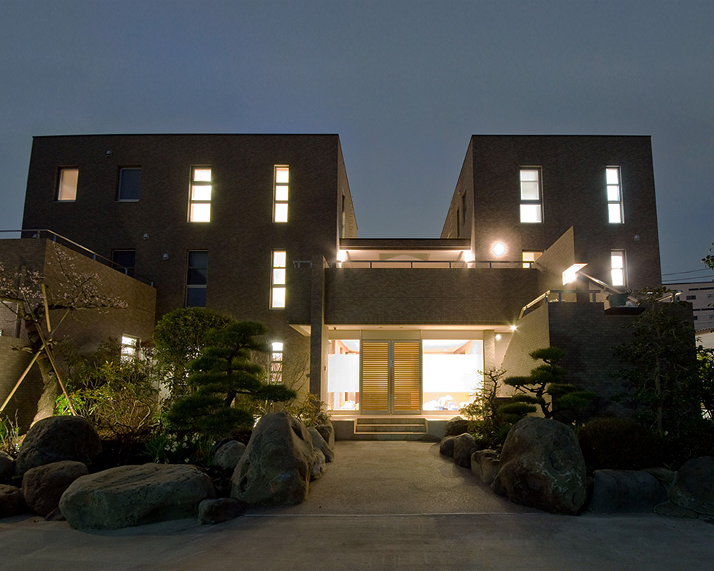 強固な壁式RC造を採用した、親世帯と子世帯が共に暮らす完全分離型3世帯住宅です。3世帯が程よく繋がりながらも快適に過ごせるよう、各世帯のプライバシーを重視し、共有スペースの開口は小さく、プライベートスペースの開口は大きく取っています。 近所の皆様が寄り合う住まいということで、応接を兼ねた10畳ほどのエントランス、20畳ほどの集会所を設けました。2階3階に配置された子世帯は大きな吹き抜けのあるメゾネットタイプを採用し、庭代わりに広々としたルーフバルコニーを設けました。