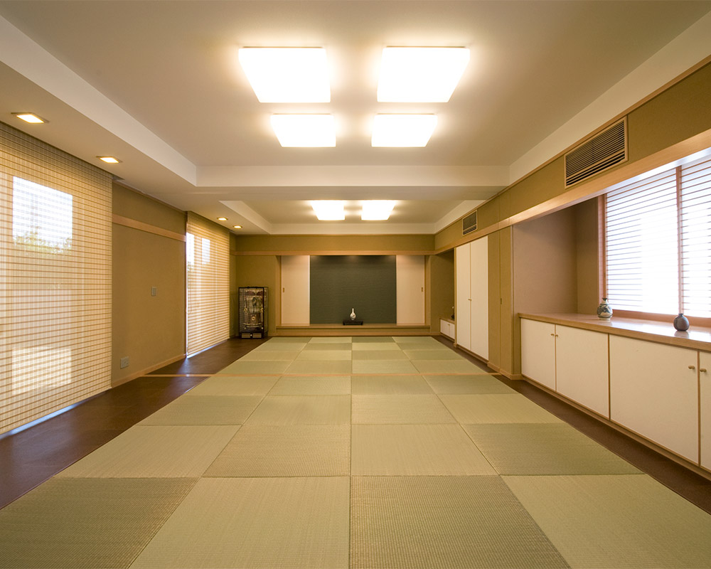 人が集まる事が多いとのことで、特別に設けた寄合場。間仕切りを収納することで延べ30帖以上の大空間が現れる。 単純な続き間の和室ではないものをご希望されていたため、和の雰囲気にモダンなテイストを織り交ぜた空間とした。 右手の収納には椅子が収納されており、高齢の方にも配慮。