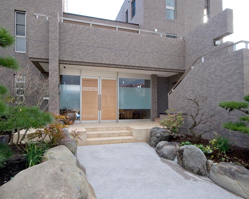 アプローチの植栽や庭石に既存のものを再活用し、かつての暮らしを留めた親世帯エントランス。