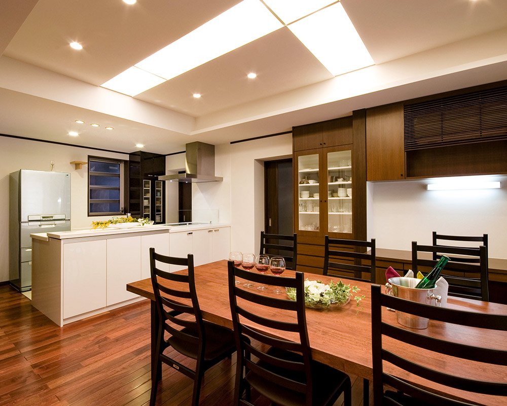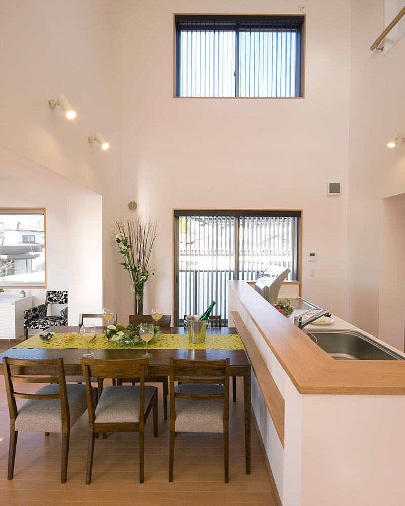 アイランドキッチンには換気扇を内臓し、キッチン・ダイニングの上部は障害物のない、大きな吹抜けとした。