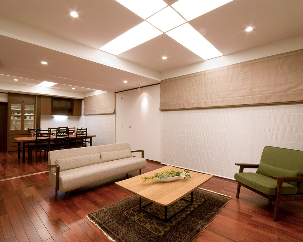 大きなシェードカーテンを取り付けた落ち着きのある親世帯のリビング。