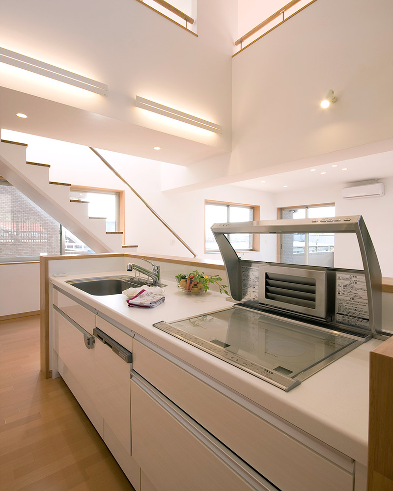 キッチンは白を基調とし、吹き抜けとの相乗効果でより開放感が感じられる。