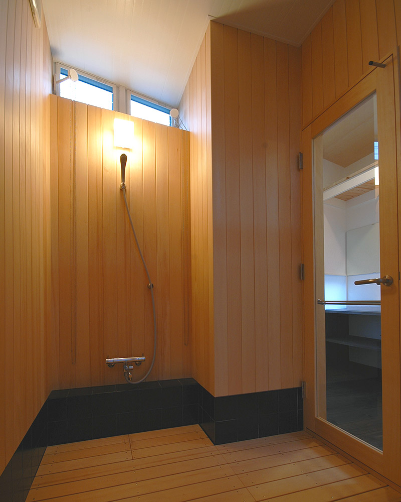 脱衣所へのドアは大きなガラス戸とし、浴室内にはハイサイドライトを設けた。木に囲まれ、モダンな印象の浴室。