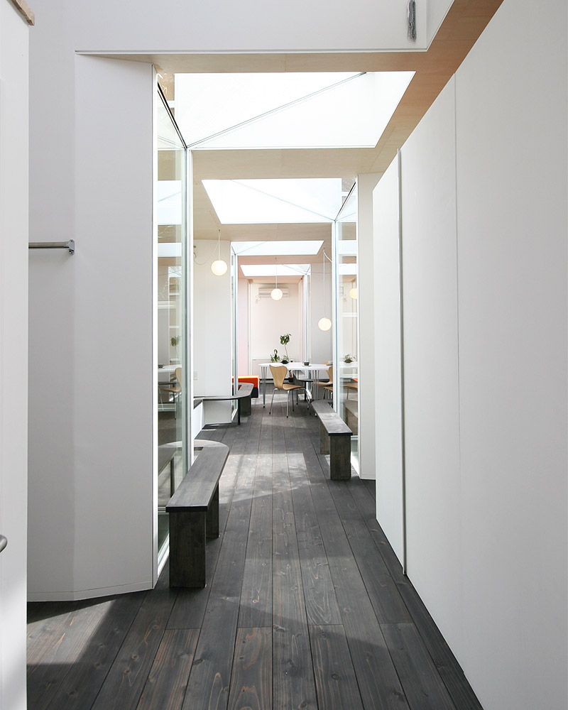 キューブとキューブを繋ぐ回廊。白い壁とガラス張りの壁面に加え、天井の明り取りからも採光できるため非常に明るく開放感のある空間。