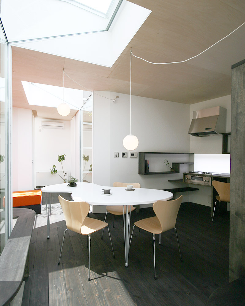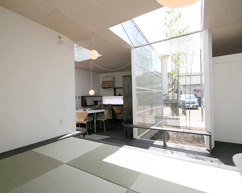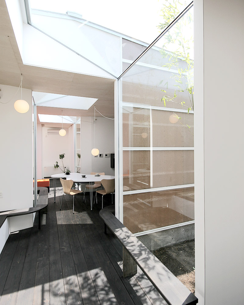 外部から視線が届く面の開口は小さくデザイン。空間を一続きにするのではなく凹凸を設けることで通風と採光を確保し、また視覚的なアクセントにもなっている。
