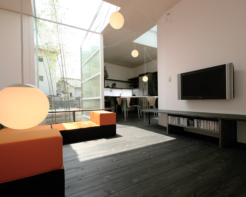 色鮮やかなオレンジ色のソファを置いたリビングスペース。 L字のソファが廊下とリビングを緩やかに仕切る。