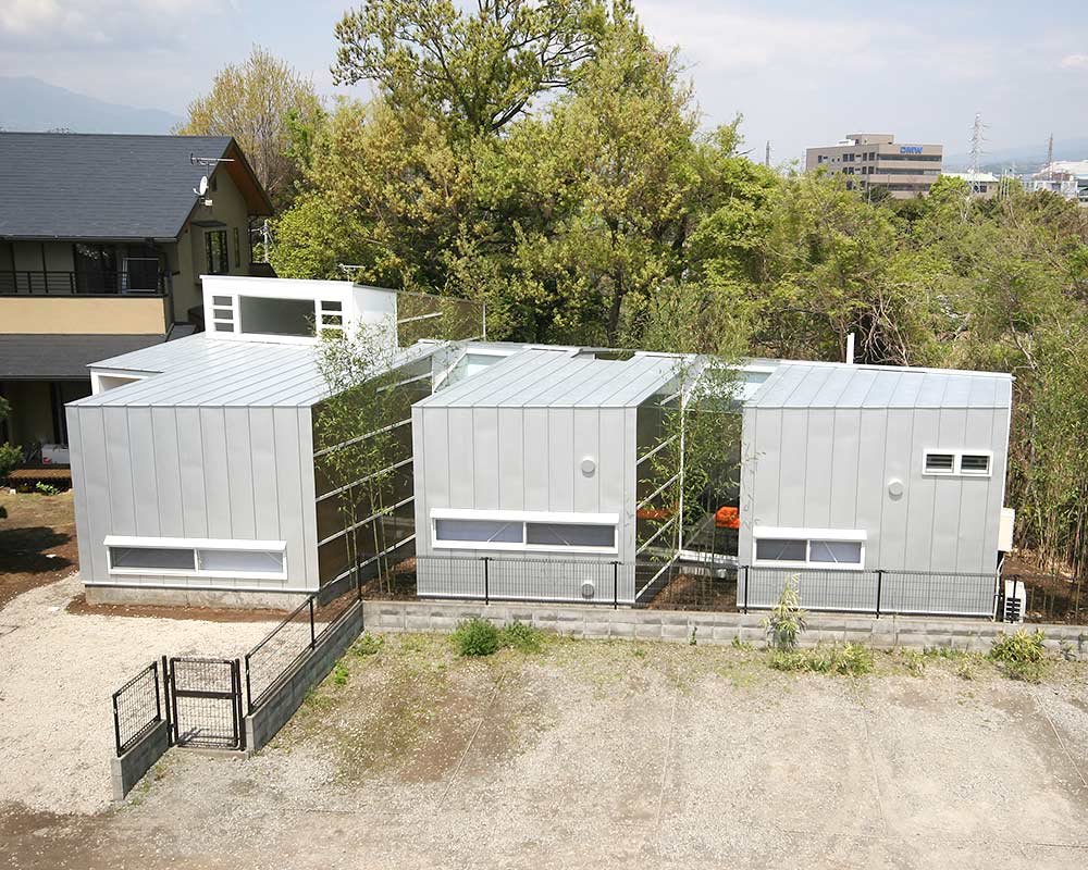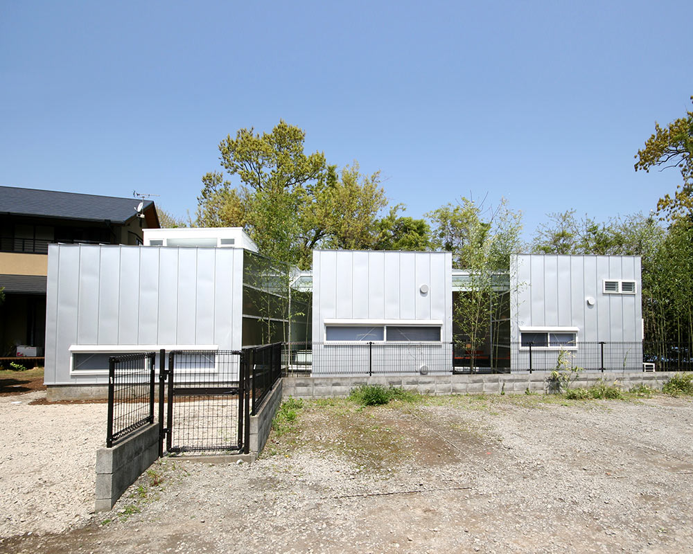 ガラスとガルバリウム鋼板という異なる素材を組み合わせ、キューブ状の空間を繋げたデザイナーズ住宅。