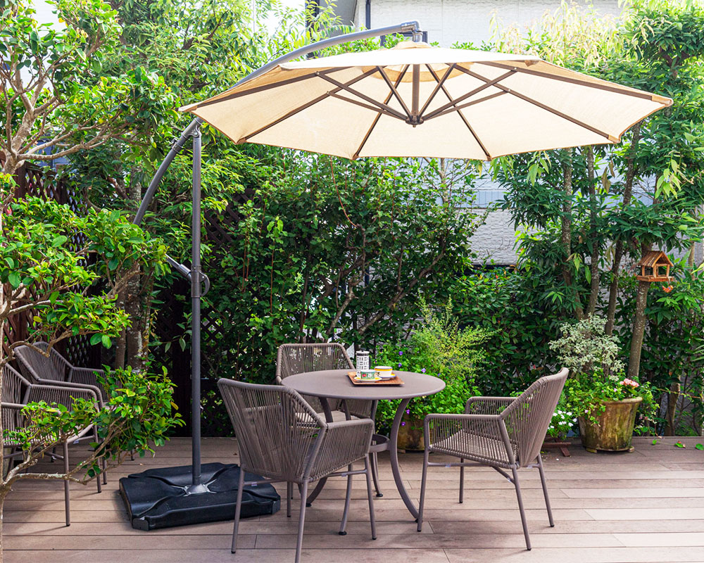ウッドデッキはメンテナンスが容易な木粉樹脂製に変更した。バードハウスを設置し、鳥たちの営みをリビングから楽しめる。