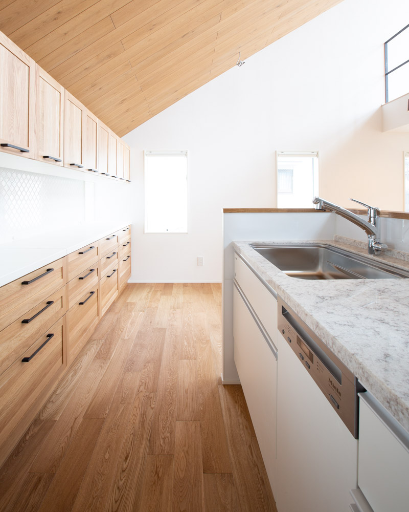 勾配天井、床の木質感と合わせたキッチン背面収納。
