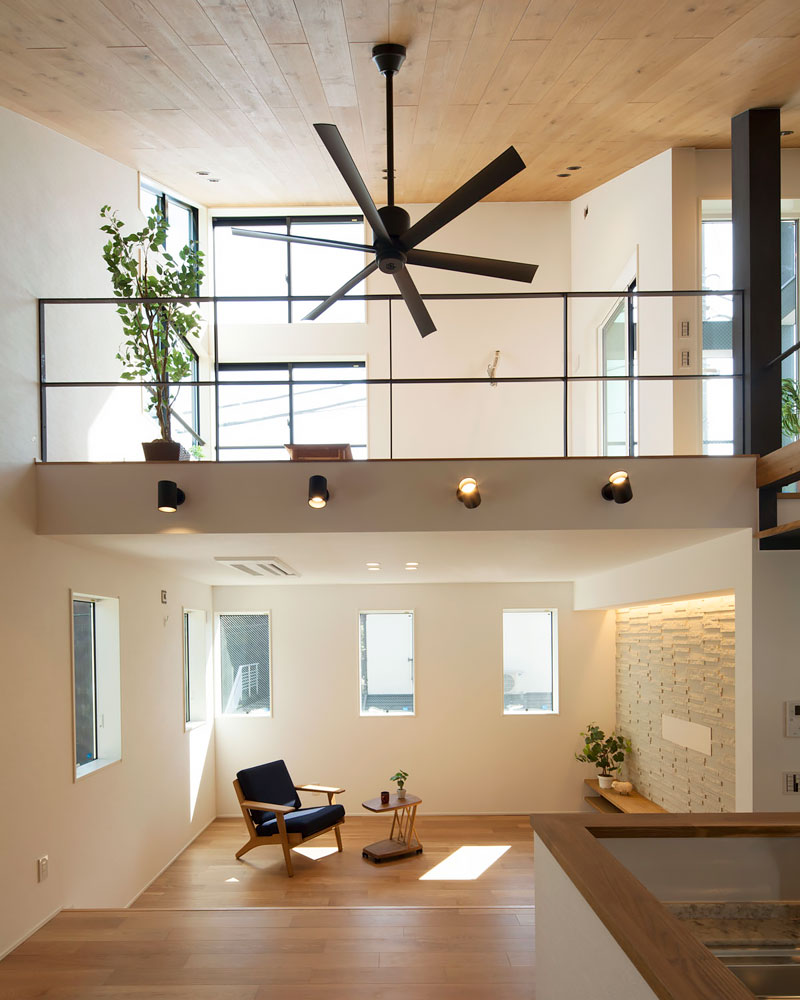将来を見越してつくる「子供部屋」は、それが必要な時期になるまで、物置やプレイルームとして漠然と使用されがちです。 こちらのお住まいは特定の期間中「デッドスペース」になってしまう空間を、見晴らしの良いサブリビングとして有意義に活用。 いずれは壁を設けて独立した子供部屋とする予定です。 3階は床の一部を敢えて吹抜けにすることで、床面積以上の広さを感じる空間に。キッチンとの距離も近く、利便性の高い間取りとなっています。