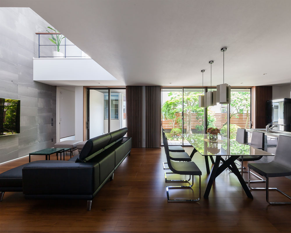 庭に面した大開口には、リモコン操作で開閉できるナニック製の電動ブラインドを採用。ブラインドと玄関・和室の建具を高級感のあるナニック製品で纏めることで、空間全体をグレードアップし、統一感を生んでいる。